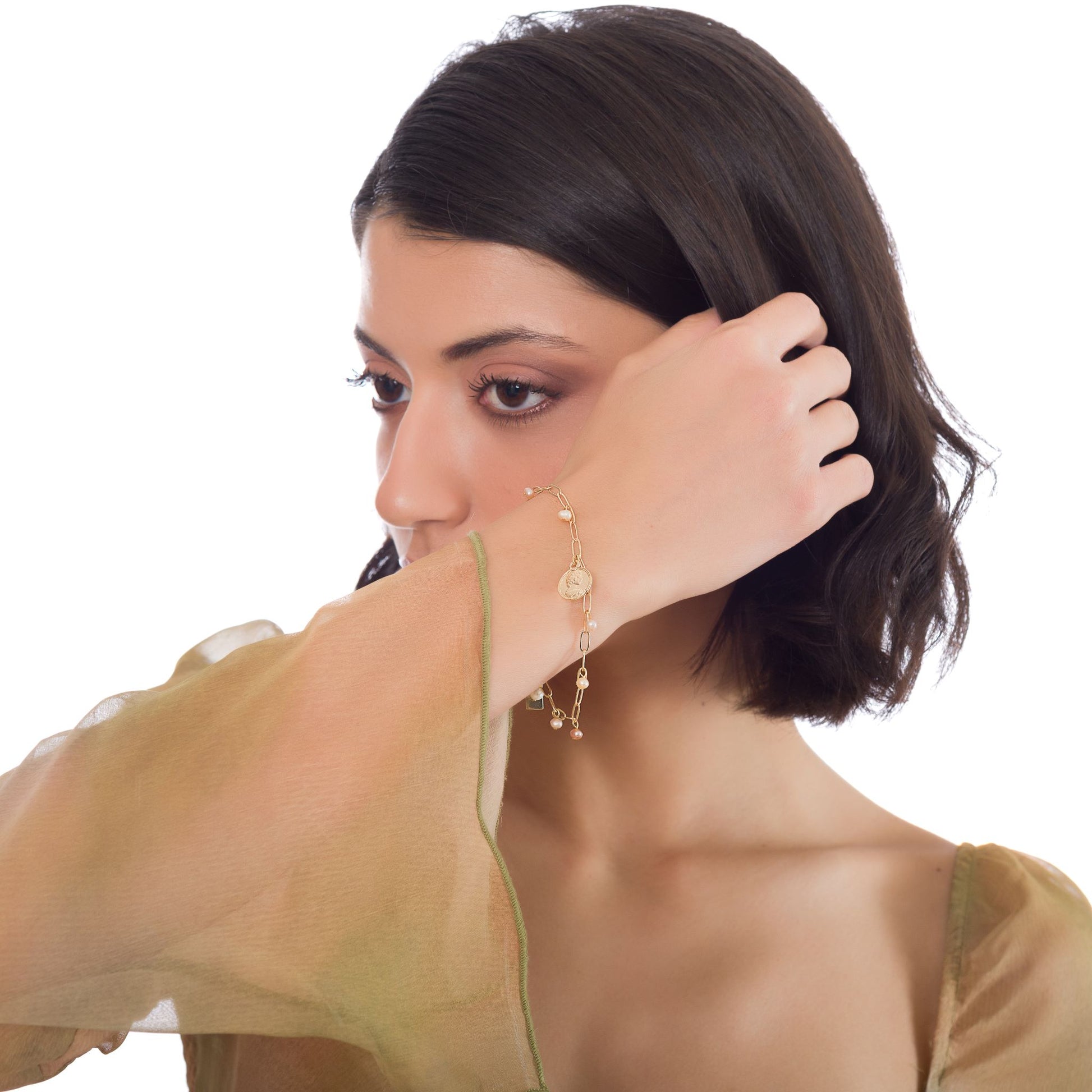 KRONA armband är en majestätisk skapelse som kombinerar små sötvattenpärlor med ett kungligt guldmynt på 14K guldpläterad mässing. En symbol för både skönhet och makt.