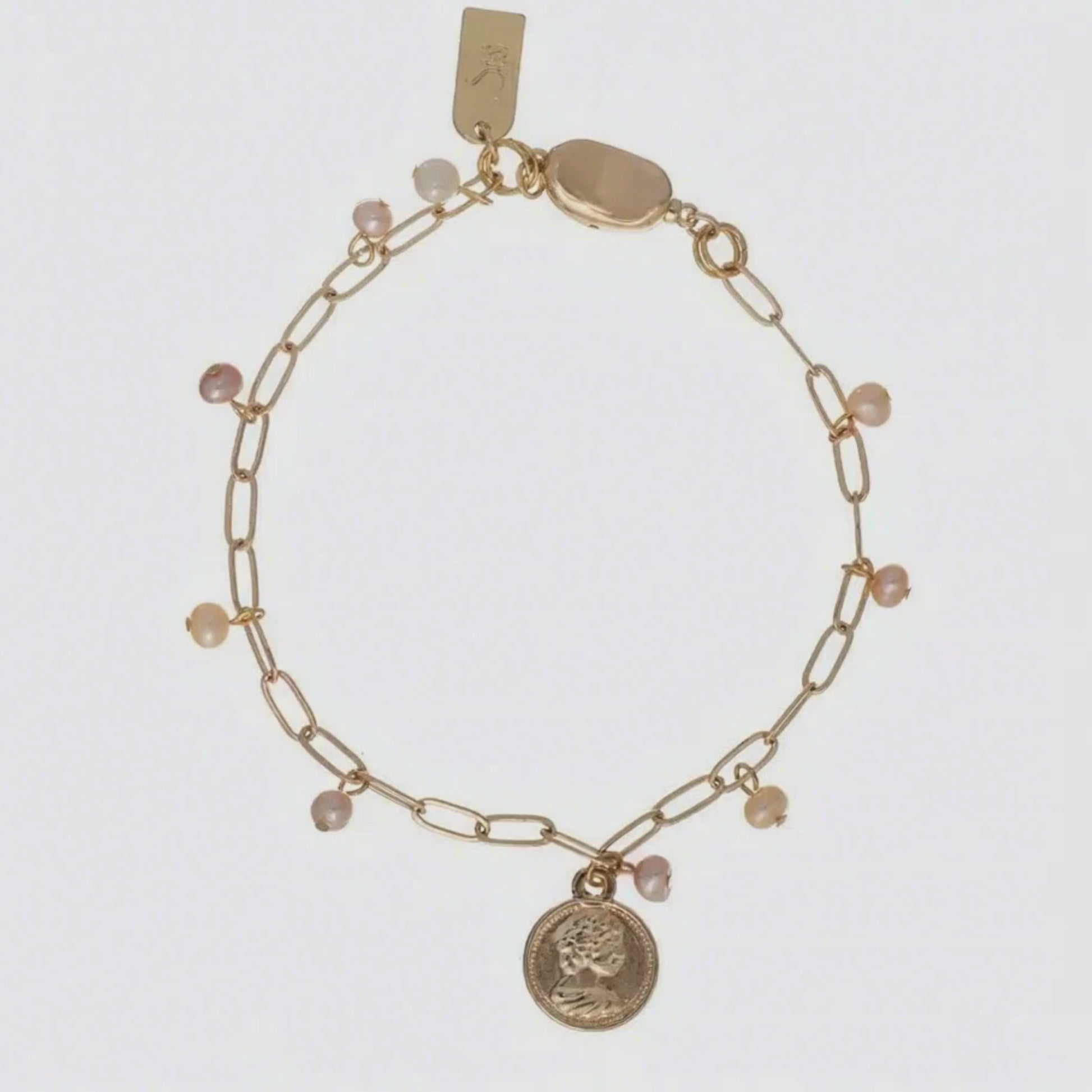 De mjukt glänsande pärlorna skapar en harmonisk kontrast till det dekorativa myntet, medan de guldpläterade detaljerna ger armbandet en varm och sofistikerad finish. KRONA är ett statement-smycke som bärs med självsäkerhet och passar lika vackert till vardag som till fest. Matcha med ROYAL halsband för en komplett och kungligt inspirerad look.