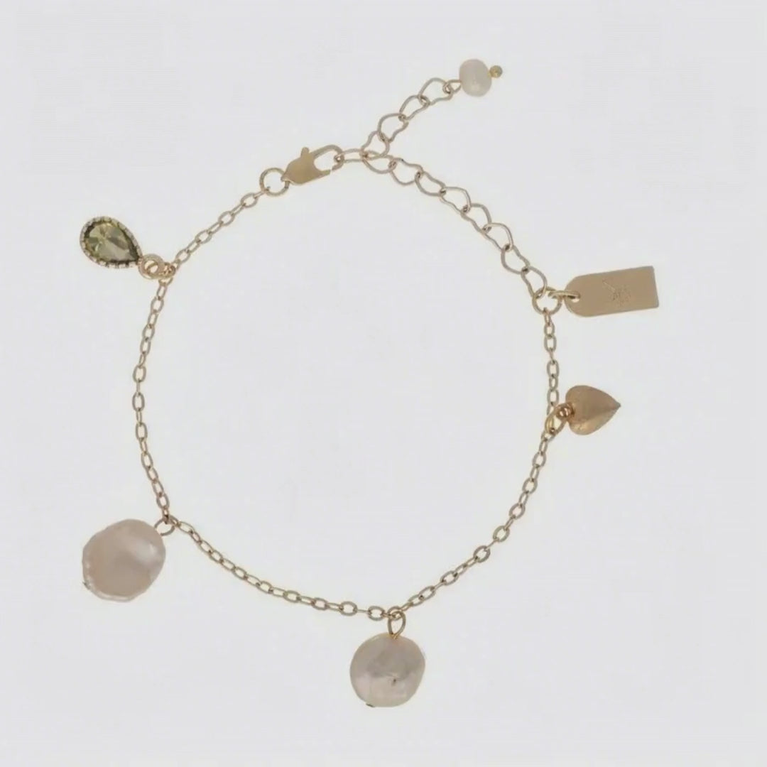SKOGSMAGI armband är ett handgjort smycke inspirerat av mötet mellan skog och sjö. Skimrande baroque sötvattenspärlor kombineras med ett guldhjärta som symboliserar kärlek och harmoni.