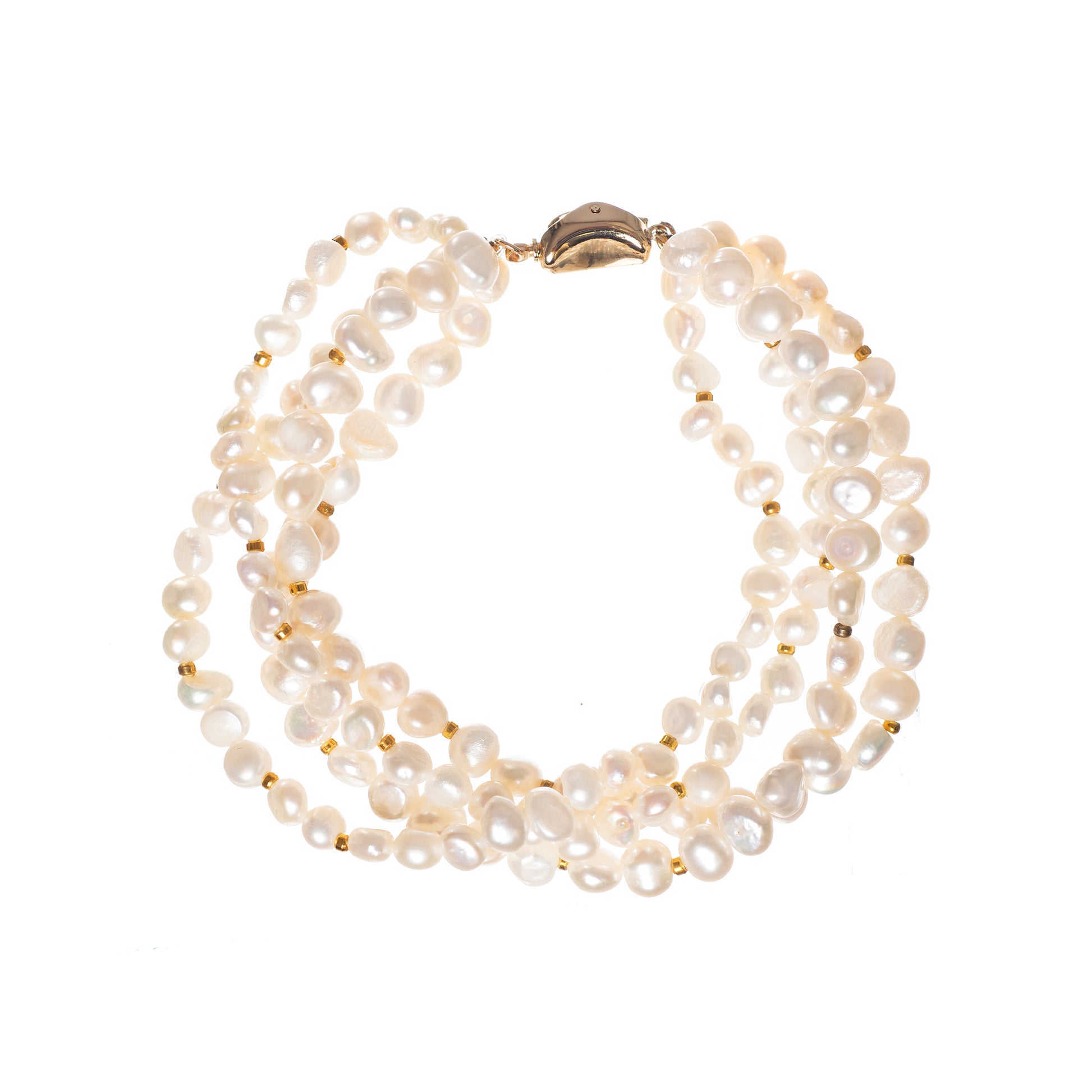 PÄRLSJÖ är ett modernt och unikt armband som fångar uppmärksamheten med sitt fyrradiga arrangemang av skimrande sötvattenpärlor i olika storlekar. Dess klassiska design och fylliga struktur ger en lyxig känsla, perfekt för både vardag och fest.