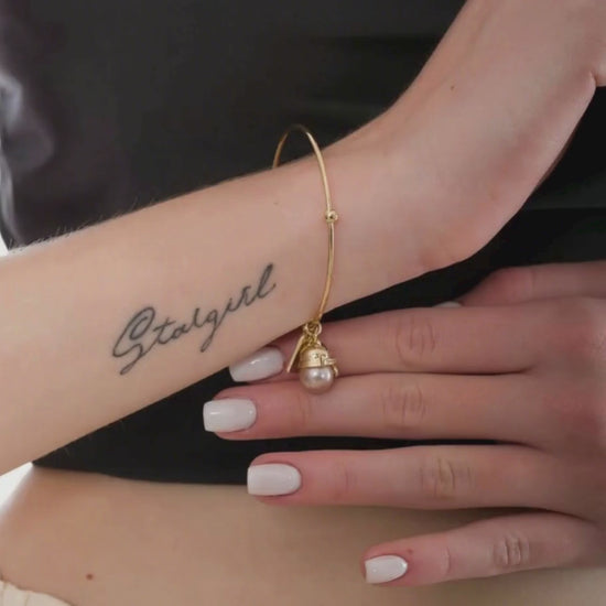 KATTSOL är ett elegant bangle-armband som förenar tidlös design med lekfull exklusivitet. Smycket pryds av en unik sötvattenpärla, vars naturliga lyster möter en detaljrik guldkatt dekorerad med gnistrande zirkoner. Den varma guldtonen i 14K guldpläterad mässing ger armbandet en lyxig känsla som lyfter varje outfit.