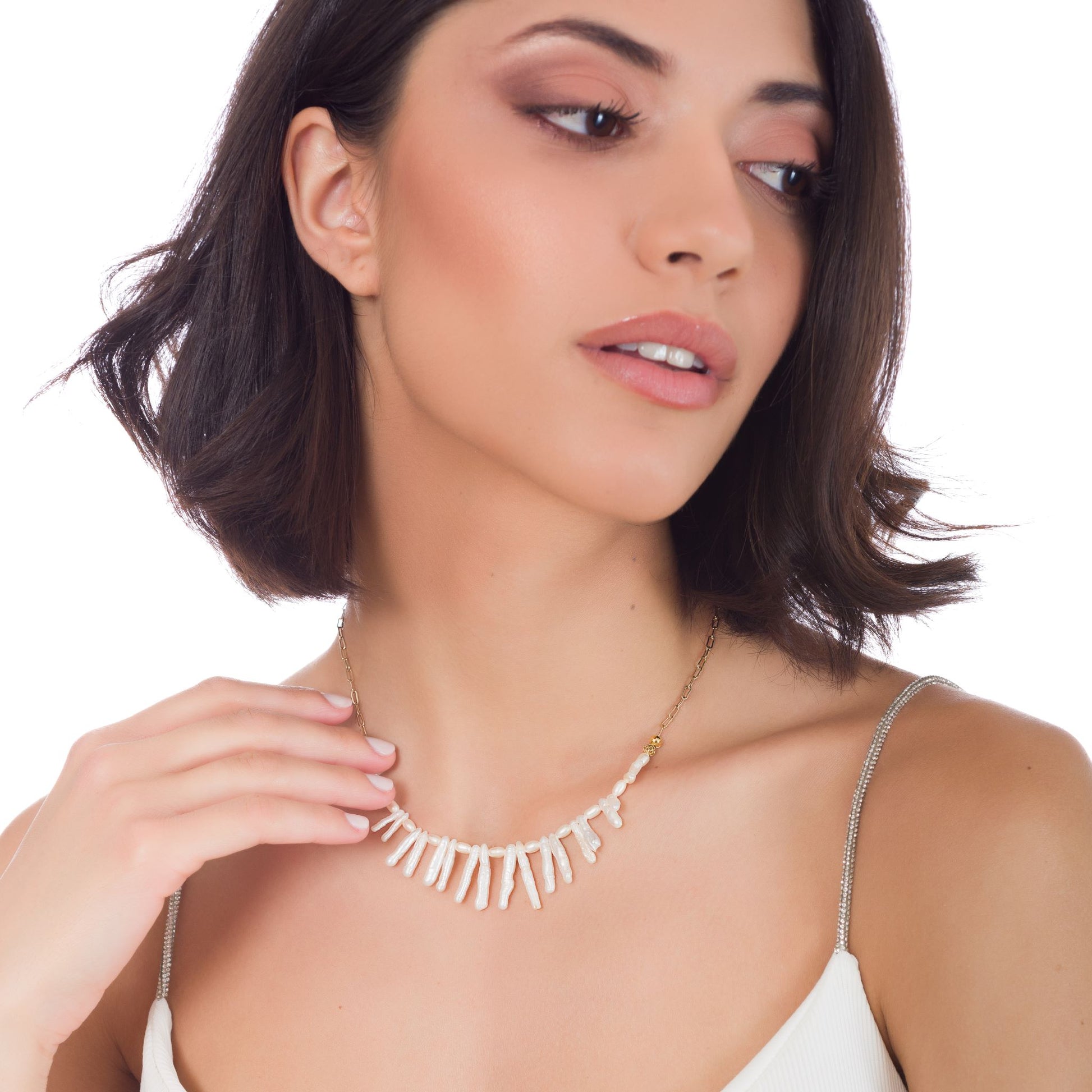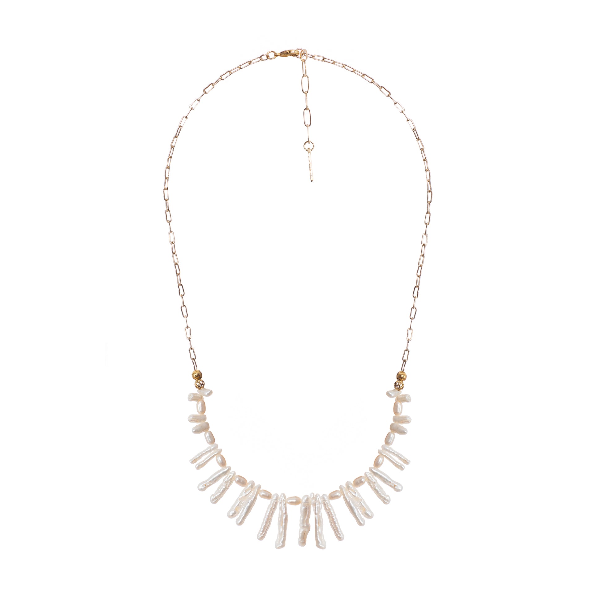 PÄRLOCEAN är en unik och iögonfallande smyckesdesign som för tankarna till havets djup och rörelse. De oregelbundna, avlånga formerna av baroque pärlorna på 14K guldpläterad mässing ger halsbandet en dynamisk och organisk känsla.