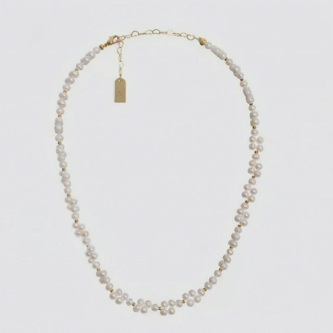 BLOMSTERÄNG är ett förtrollande pärlhalsband där naturens mjuka former möter tidlös elegans. De blomformade sötvattenpärlorna skapar ett romantiskt och feminint uttryck med en mjuk, levande lyster.