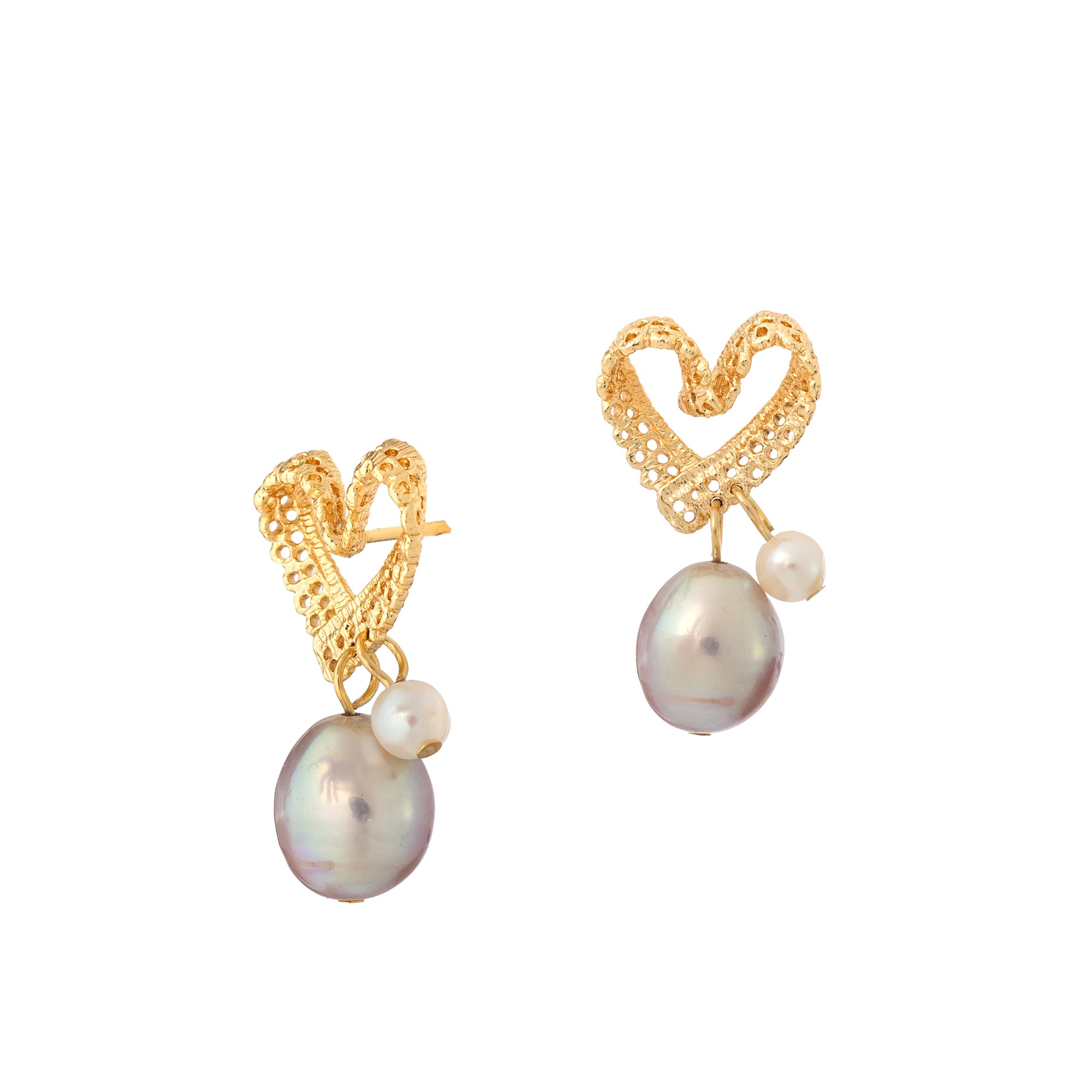 KÄRLEK är en romantisk skapelse med eleganta guldhjärtan och skimrande sötvattenpärlor på 14K guldpläterad mässing. Denna design skapar en känsla av tidlös romantik och skönhet. Perfekt gåva för att uttrycka djupa känslor och passion.